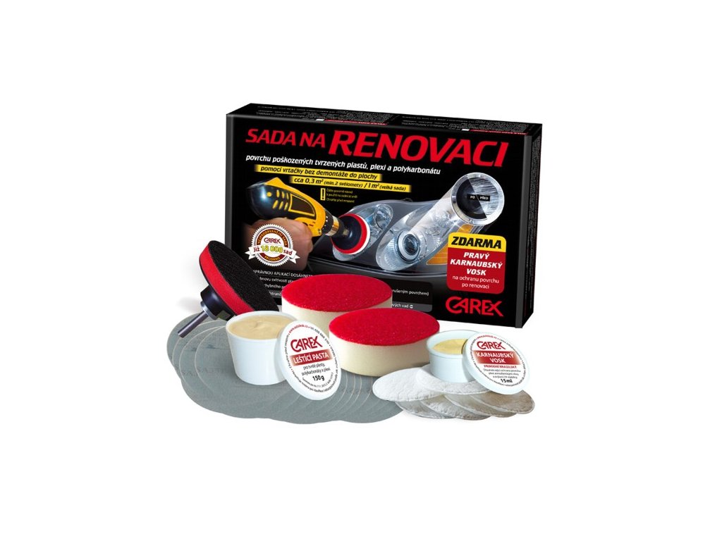 SADY DOSTUPNÉ NA TRHU SE DĚLÍ NA: 1. Sady na renovaci povrchu světlometů, vč. sad CAREX – tento typ sad určen výhradně pro práci pomocí leštičky nebo vrtačky, by měl splňovat schopnost odstranit broušením z renovovaného povrchu světlometů poškozenou vrstvu (dírky z odlétávajících kamínků, zoxidovanou nebo naleptanou vrstvu, znehodnocenou např. přeleštěním pastou určenou pro autolak či jinými rozpouštědly, dále zašlý krycí lak světlometů, ať už zmatnělý, popraskaný nebo zežloutlý, rýhy po menší havárii, kdy není kryt světlometu prasklý skrz, apod.). Následným postupným broušením jemnějšími zrnitostmi kotoučů se povrch připraví na finální zaleštění a znovu zprůhlednění. Je-li v sadě pasta, určená pro leštění plastů mechanickou cestou (nikoli chemickou), je nutné také leštění provést strojně, např. vrtačkou, přiloženým leštícím kotoučem. Ručně by bylo leštění zdlouhavé, až nemožné. 2. Sady na leštění povrchu světlometů – tyto sady jsou sice někdy levnější, ale jsou založeny vesměs na ručním jemném přebroušení a leštění povrchu (Kromě Sady na LEŠTĚNÍ CAREX). V mnoha případech je ovšem nutné broušením zcela odstranit poškozený krycí čirý lak světlometů, což je ale z principu těmito sadami nemožné. Následné leštění povrchu probíhá také ručně (kromě CAREX) a aby to bylo ručně možné, je pasta v konkurenčních sadě chemicky agresivní, povrch tedy leští z části chemickou cestou, laicky řečeno, naleptáním povrchu. Tento způsob bohužel znehodnocuje povrch světlometů, zůstává měkčím, tudíž náchylnějším na změny teplot, sluneční záření, méně odolné otěru při umývání. Pasty tohoto typu se hodí pouze na přeleštění malých měkkých displejů levných telefonů. Životnost takto leštěného povrchu je tedy nižší, než životnost profesionálně renovovaného povrchu (kromě přeleštění LEŠTÍCÍ sadou CAREX).