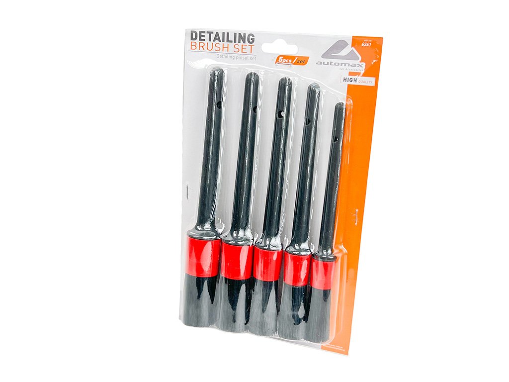 Sada 5 detailingových štětců Automax je ideální pro precizní čištění interiéru i exteriéru vozidla. Vysoce kvalitní štětiny zajistí šetrnou péči o citlivé povrchy, jako jsou ventilační mřížky, disky kol nebo palubní deska.