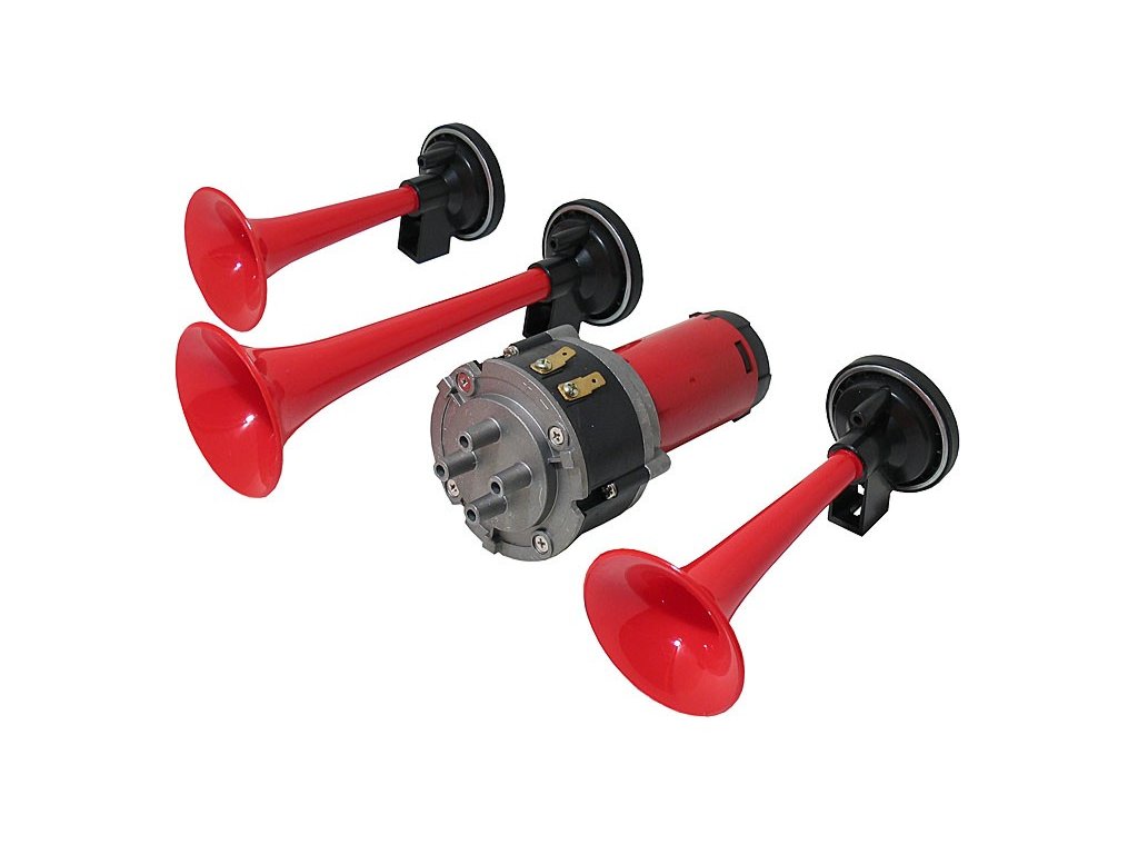 Tónová sada fanfár 12V. 3-trubkové fanfáry poháněné vzduchovým kompresorem se střídavým zvukem. Správné řešení, když originální klakson nevyhovuje, nebo je nedostatečně hlučný.