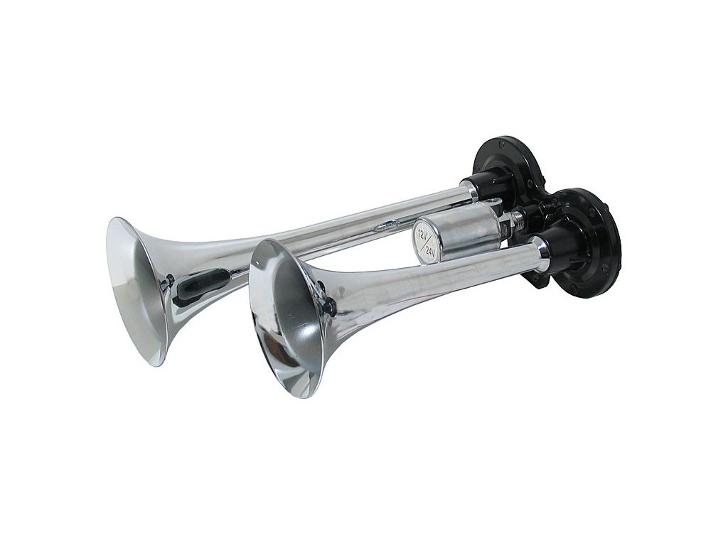 Vzduchová fanfára 2trubková s elektromagnetickým ventilem 12/24V. Fanfáru je nutno zapojit na vzduchový obvod vozidla.