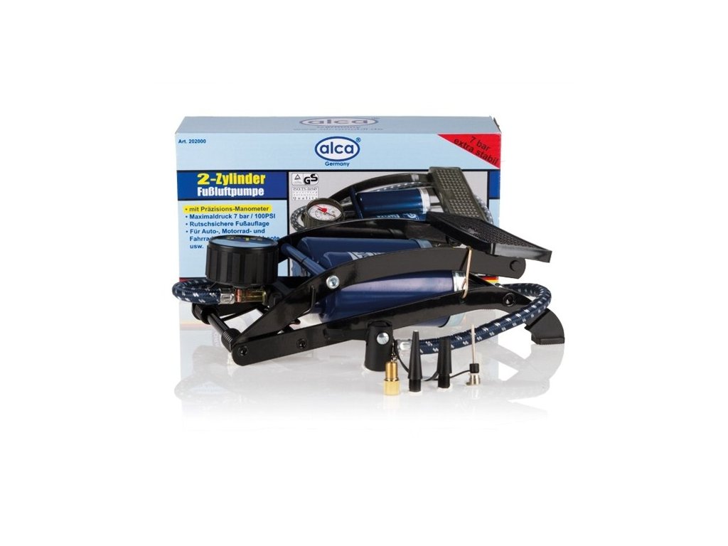 Kovová hustilka ALCA se dvěma písty, určená pro huštění pneumatik osobních automobilů. Součástí balení jsou přídavné adaptéry pro huštění gumových matrací, míčů apod.
