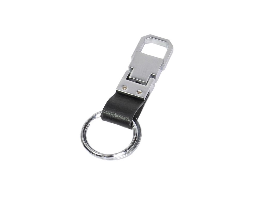 Designová kovová klíčenka s karabinou. Kožený detail podtrhává design klíčenky.