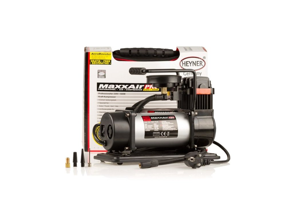 Výkonný 230V kompresor s manometrem MaxxAir PRO 500W. Praktický přenosný kompresor do automobilu od německého výrobce HEYNER.