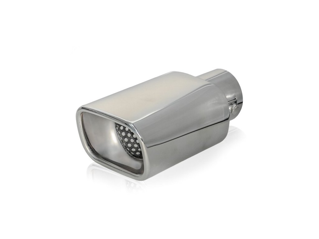 Hranatá koncovka výfuku se zkoseným tvarováním v chromové barvě.