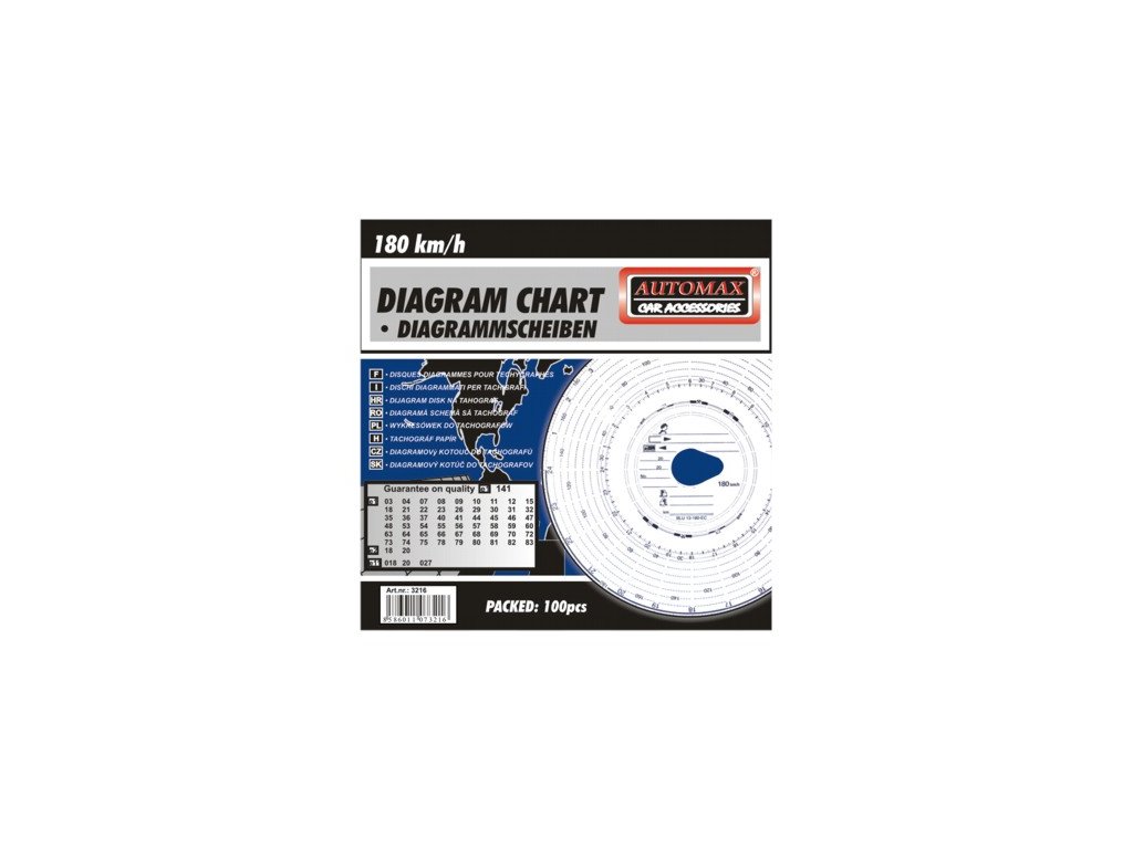 Diagramový kotouč do tachografu pro zaznamenávaní údajů o jízdě vozidla. Kotouč je vhodný pro záznamy při rychlosti do 180 km/hod.