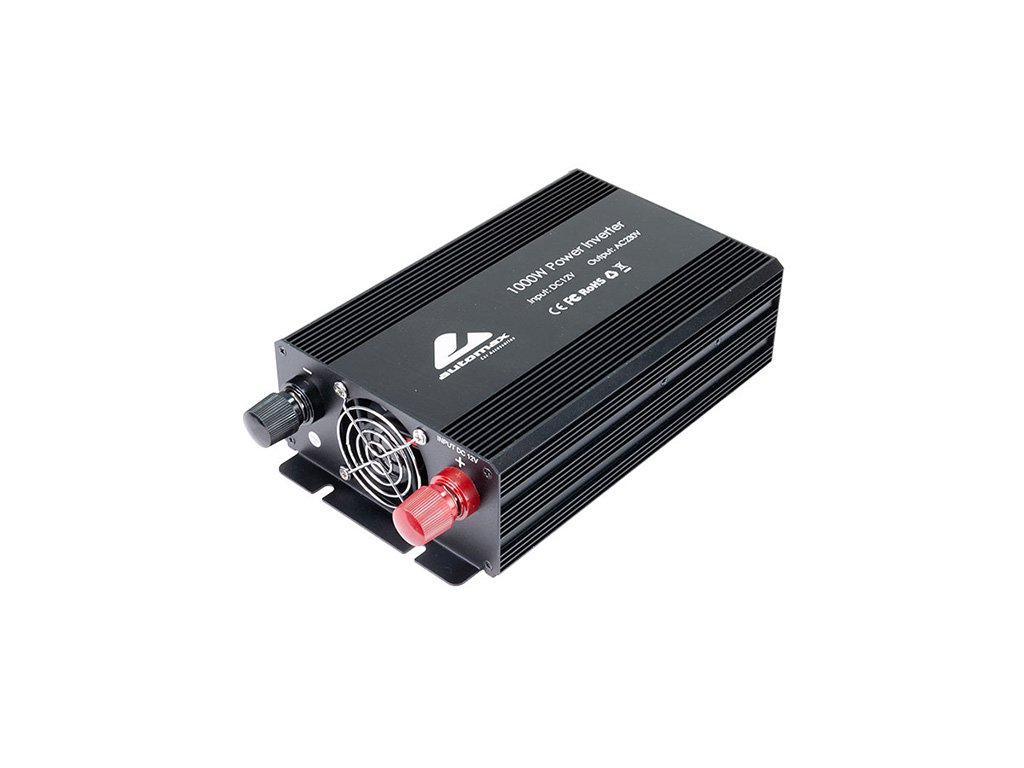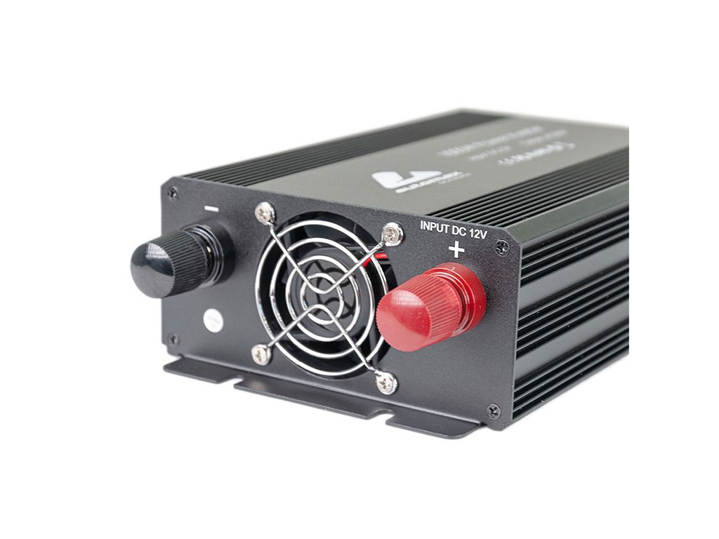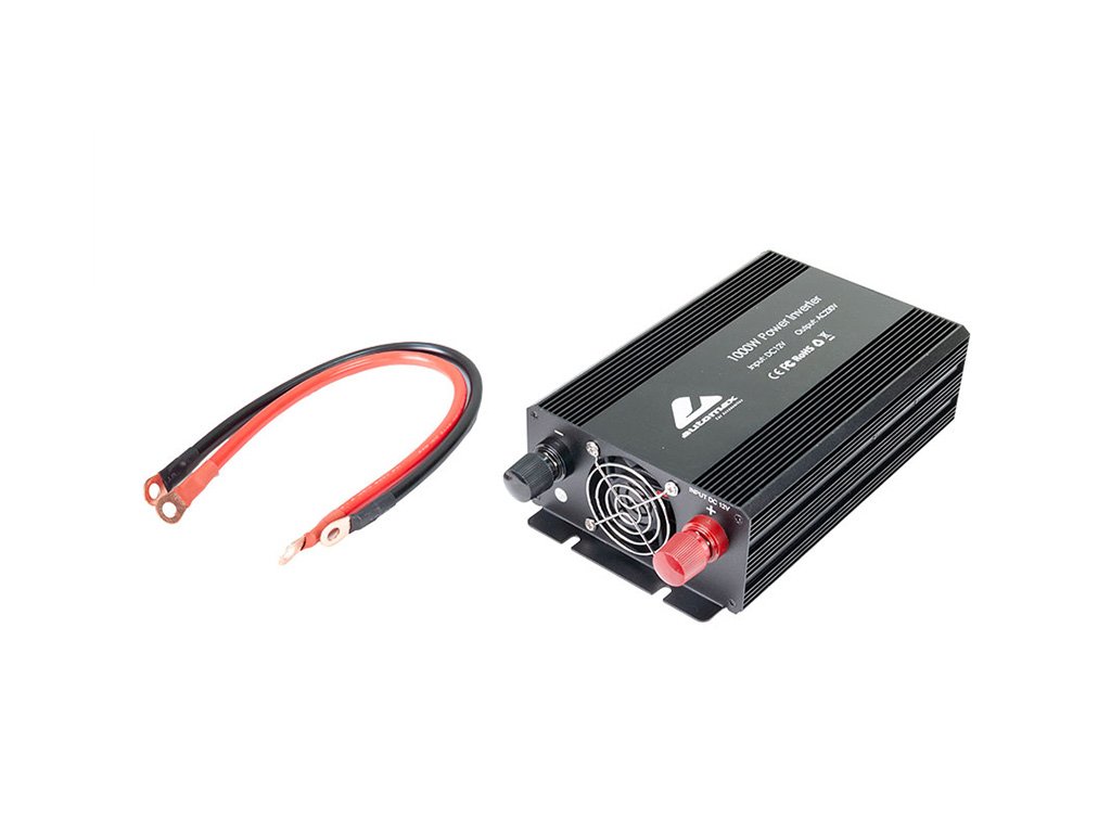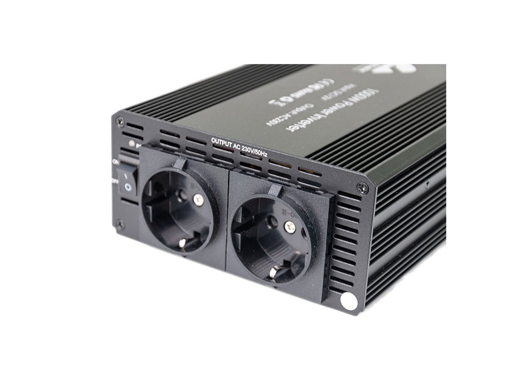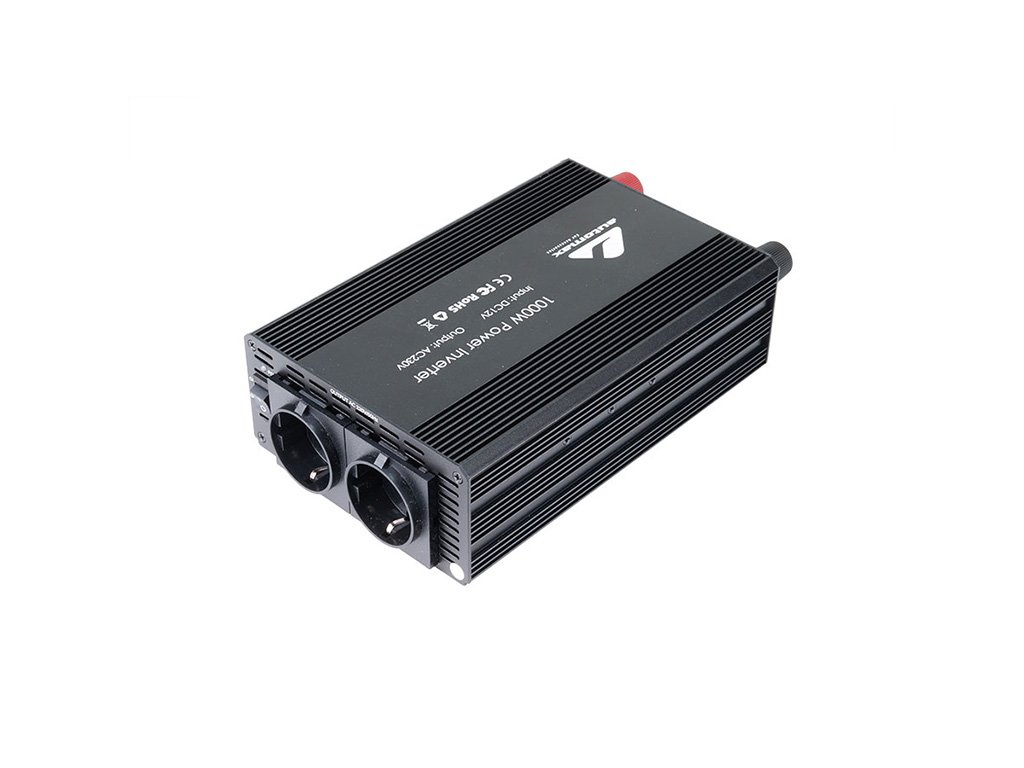 Výkonný měnič napětí z 12V na 230V s účinností >90% a výkonem 1000W. Umožňuje napájení 230V zařízení z 12V baterie automobilu. Obsahuje On/Off spínač a 2 AC EU zásuvky.