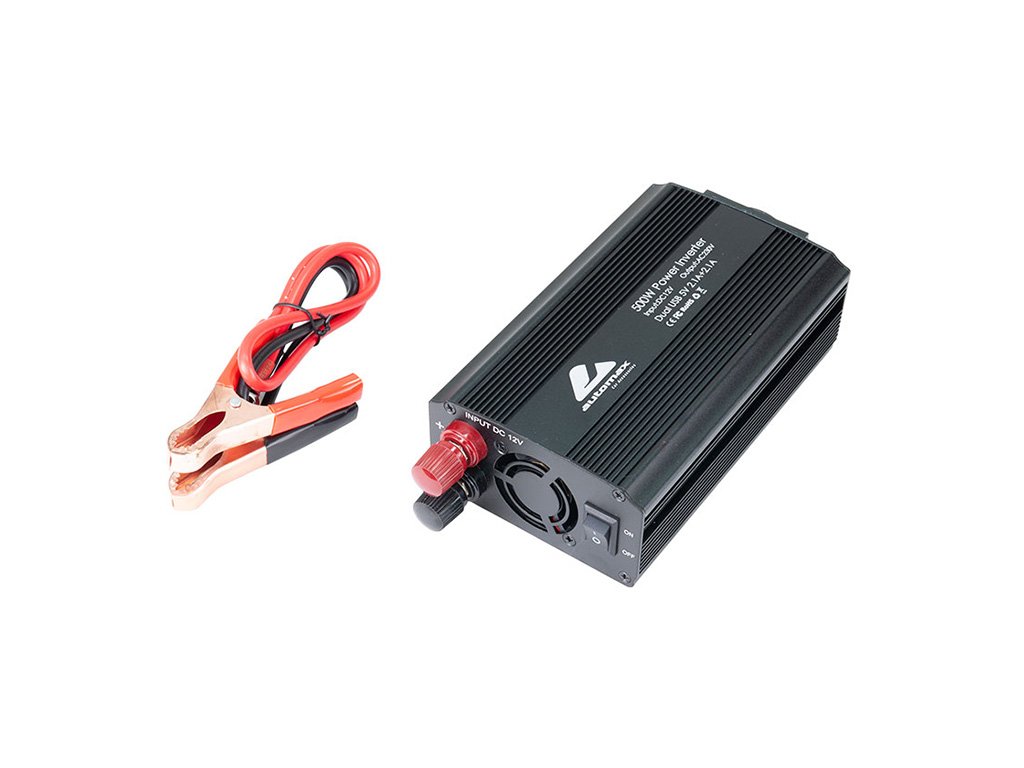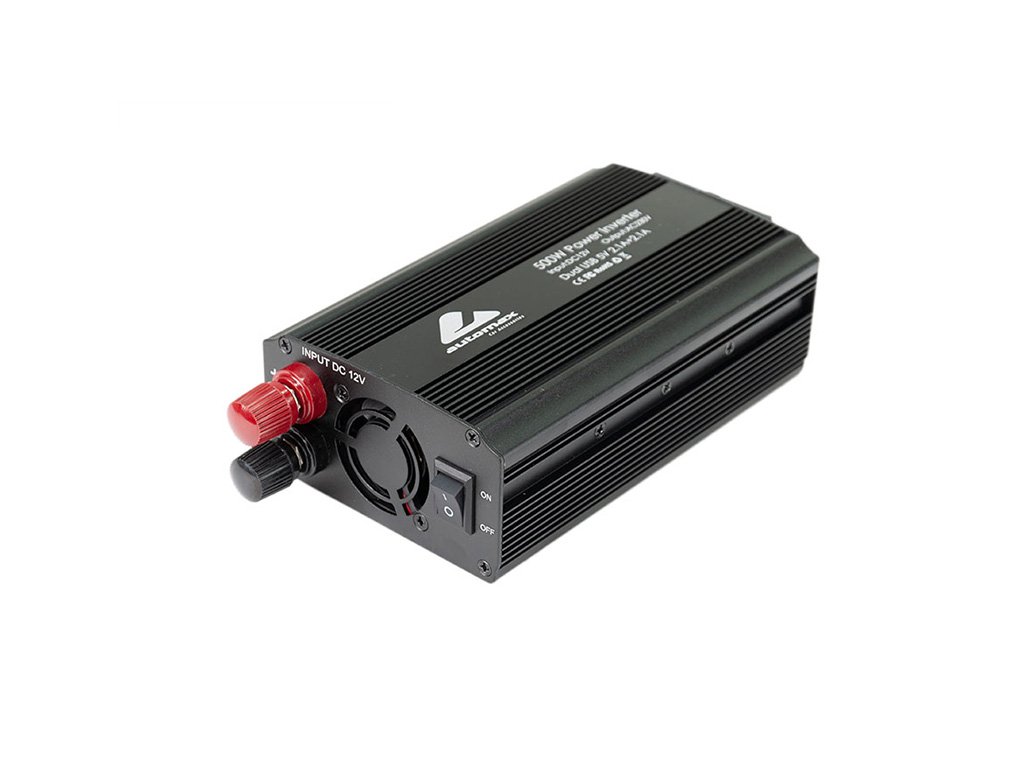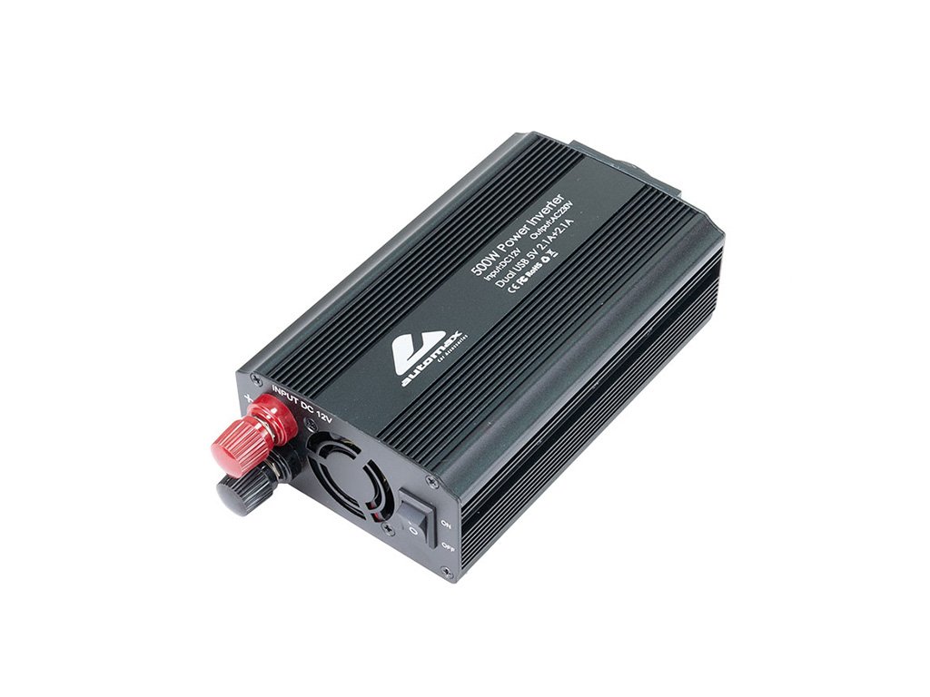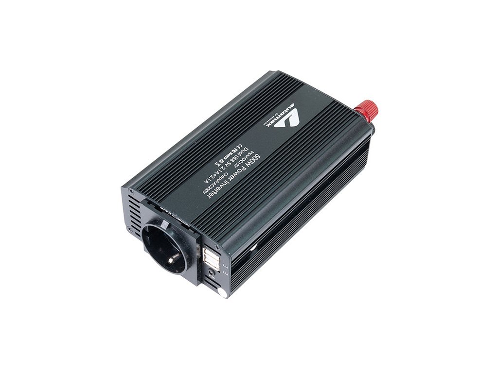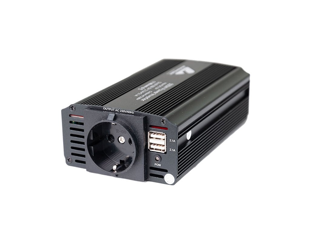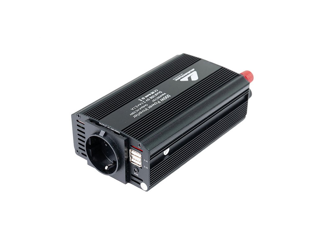 Měnič napětí z 12V na 230V s USB konektory umožňuje napájení 230V zařízení z 12V baterie automobilů. Obsahuje 1 AC EU zásuvku a 2 USB výstupy (5V/2100mA) pro nabíjení telefonů, fotoaparátů a dalších zařízení. Výkon 500W.