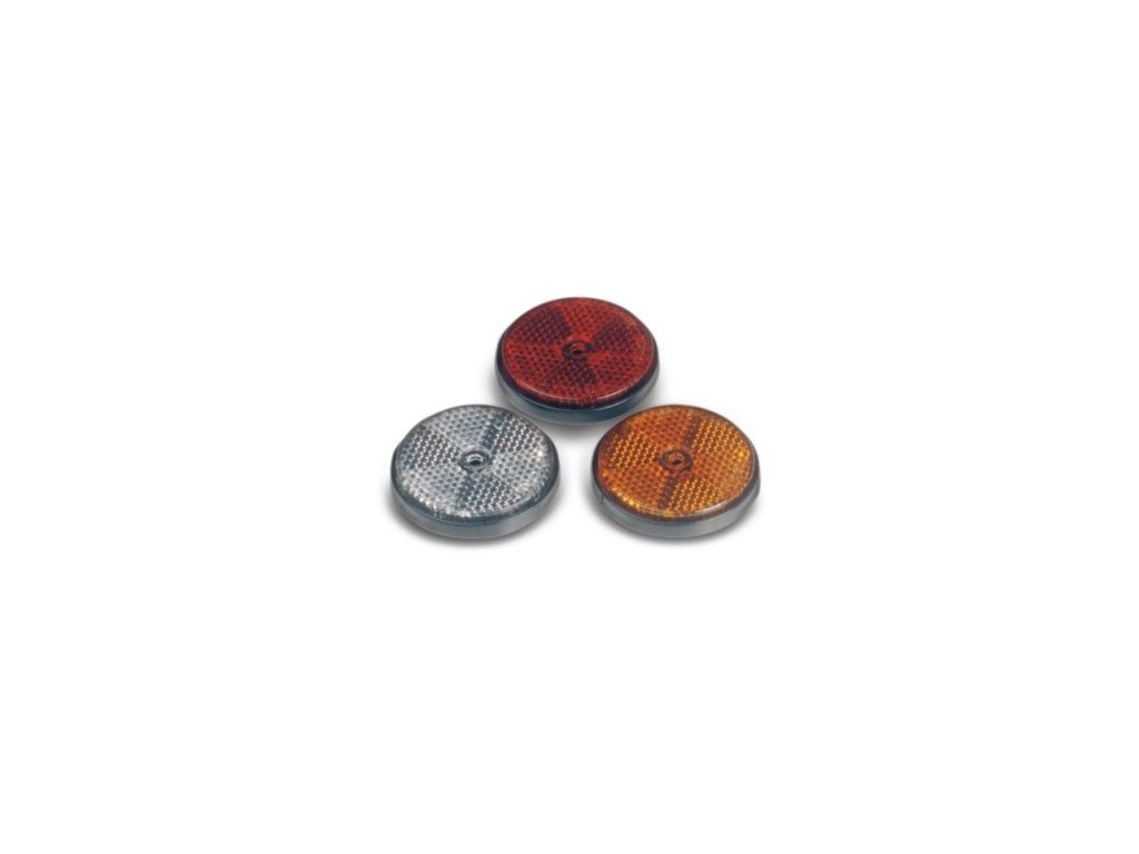 Kulatá odrazka v červené barvě, splňuje homologace E20. Klasická kulatá odrazka z tvrzeného plastu s dírkou pro připevnění.