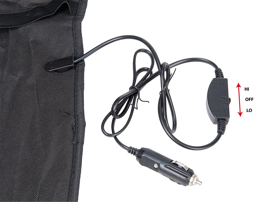 Potah se připojuje přímo do 12V autozásuvky a díky odběru 2,9 A / 35 W se rychle zahřeje. Přepínač umožňuje volbu režimu HI / OFF / LO, takže si snadno nastavíte intenzitu ohřevu podle potřeby. Součástí napájení je integrovaná pojistka 5A, která zajišťuje bezpečný provoz. Výrobek je označen certifikací CE.
