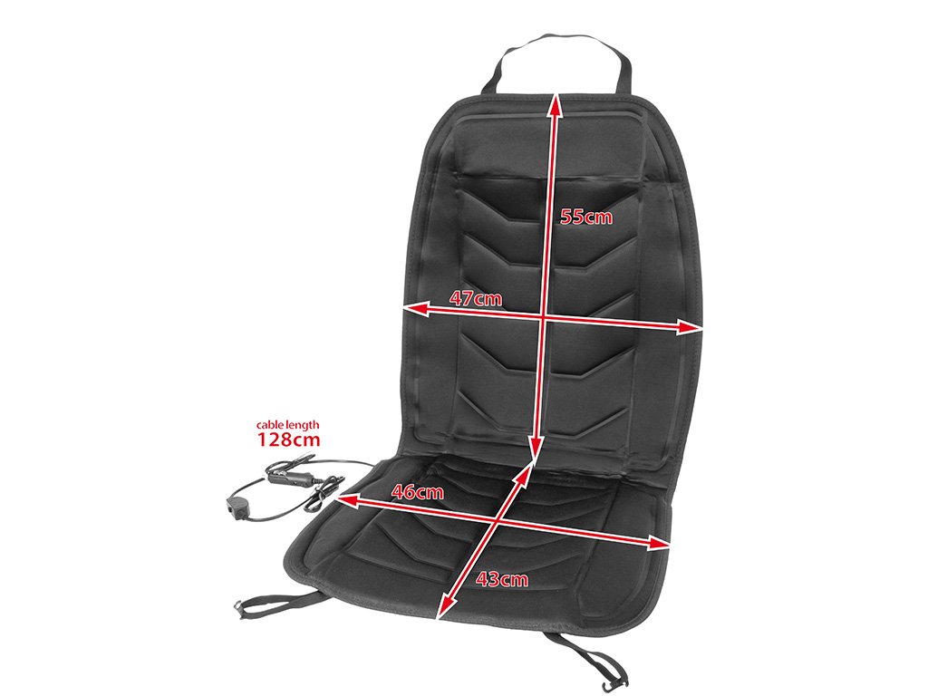 Vyhřívaný potah sedadla 12V / 35W s regulací HI / OFF / LO, rychlým zahřátím a spotřebou 2,9A. Jednoduchá instalace pomocí elastických pásků a háčků, univerzální velikost. Vybaven pojistkou 5A a certifikací CE. Kabel 128 cm. Vhodné pro většinu automobilů.