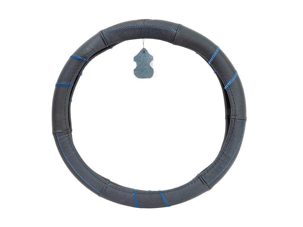 Elegantní potah na volant AUTOMAX z pravé kůže ve velikosti M (37-39 cm) s modrým prošíváním zajišťuje komfortní úchop, ochranu volantu a moderní vzhled.