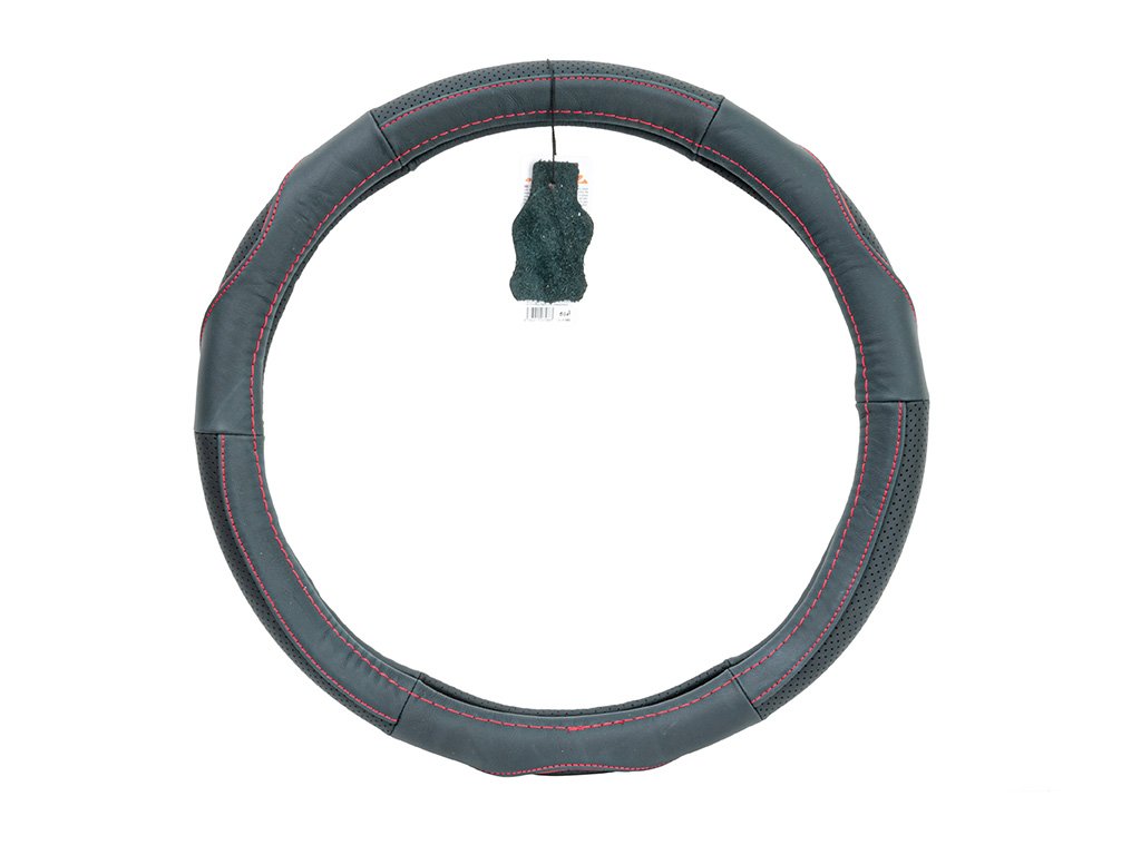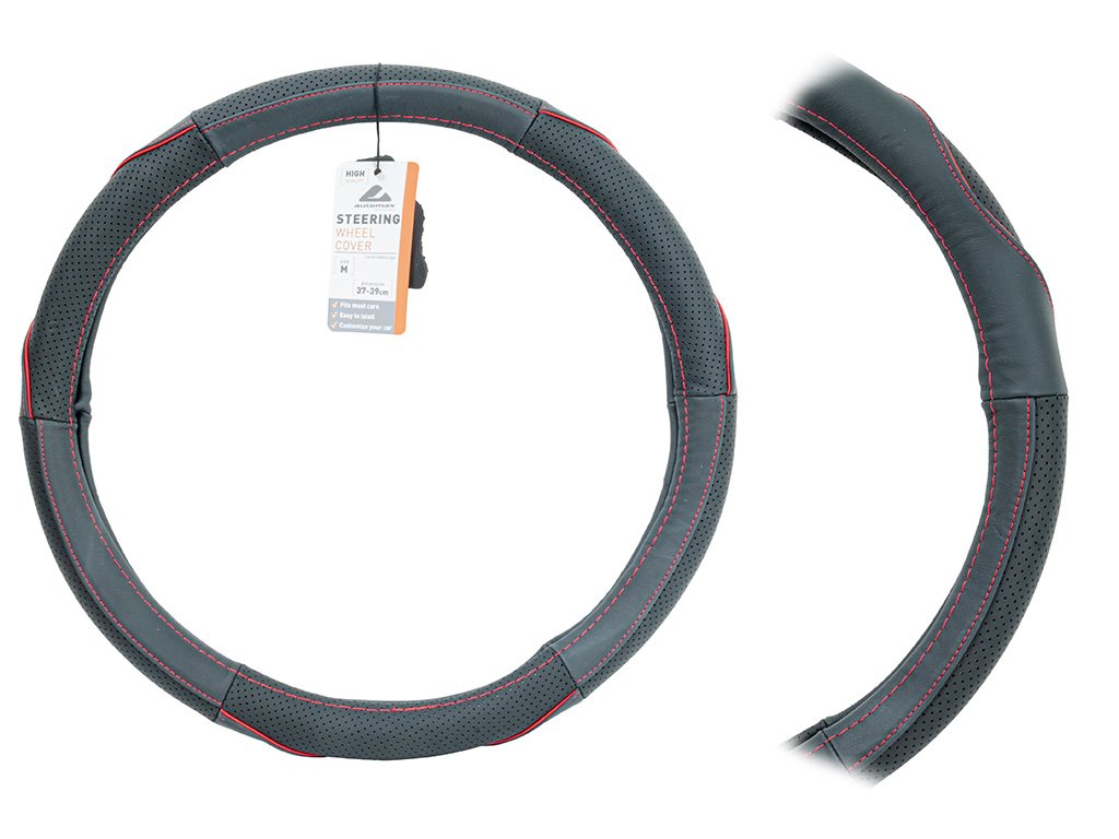 Stylový potah na volant AUTOMAX z pravé kůže ve velikosti M (37-39 cm) v černo-červeném provedení zajišťuje pohodlný úchop, ochranu volantu a moderní vzhled.