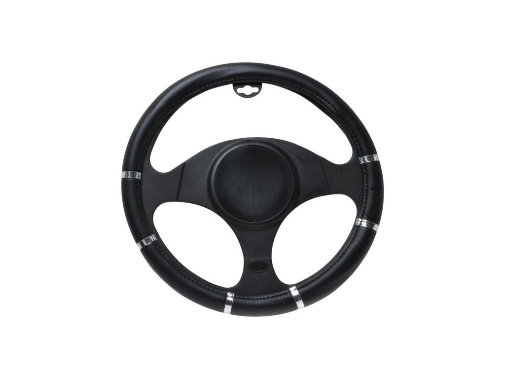 Kvalitní potah na volant SPECIAL. Design potahu je důmyslně propracován. Chromové obroučky dělící jednotlivá pole vyvolávají sportovní efekt a celkově zpříjemňují interiér vozidla. Potah na volant zlepšuje řízení vozidla a zabraňuje klouzání rukou po volantu. Chrání volant před opotřebením.