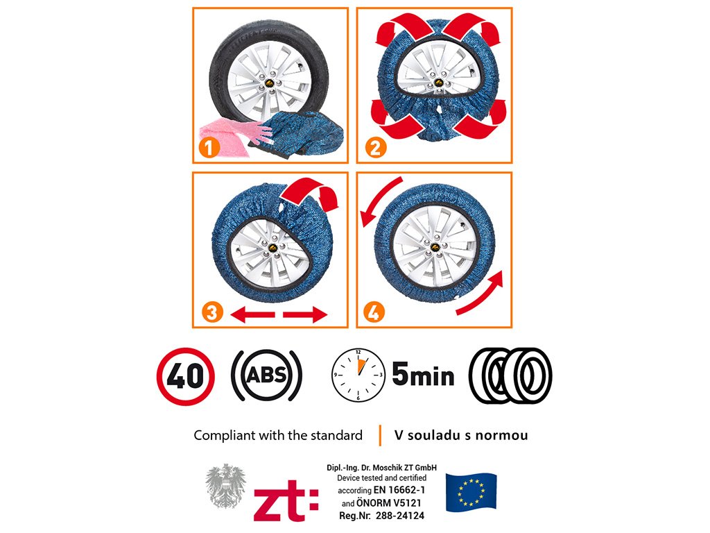 Montáž je velmi snadná – systém plug & play umožňuje nasazení přibližně do 5 minut, bez použití nářadí nebo zvedání vozidla. Produkt splňuje přísné evropské normy EN 16662-1 a ÖNORM V5121, je vhodný i pro vozidla vybavená ABS. Maximální doporučená rychlost při jízdě s řetězy je 40 km/h.