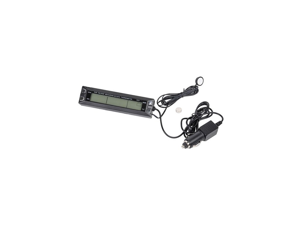 Digitální teploměr s ukazatelem minimální a maximalní hodnoty měřené teploty, hodiny a voltmetr s LED podsvícením. Kontroluje a zobrazuje napětí akumulátoru v reálném čase. Kontrolka a ikona napájení a podsvětlení teploměru se rozsvítí, po zapojení konektoru zapalovače do zásuvky zapalovače vozidla. Možnost upevnění na palubní desku automobilů, zemědělské a stavební techniky. Přístroj je možné připevnit pomocí samolepicí pásky, která je součástí balení. Velký a přehledný displej. Baterie jsou rovněž součástí balení.