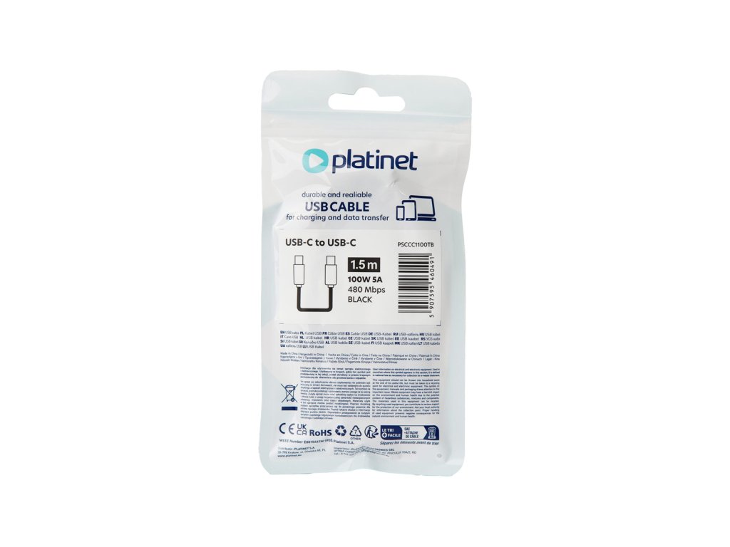 USB-C na USB-C kabel Platinet v černé barvě o délce 1,5 m je skvělou volbou pro uživatele, kteří hledají spolehlivé a výkonné řešení pro nabíjení a přenos dat. Díky podpoře nabíjecího výkonu až 100W (5A) a technologii Power Delivery (PD) umožňuje rychlé a efektivní nabíjení zařízení s vyšší kapacitou, jako jsou notebooky, tablety či smartphony. Přenosová rychlost až 480 Mbps zajišťuje bleskový přenos souborů, takže budete mít svá data vždy rychle k dispozici.