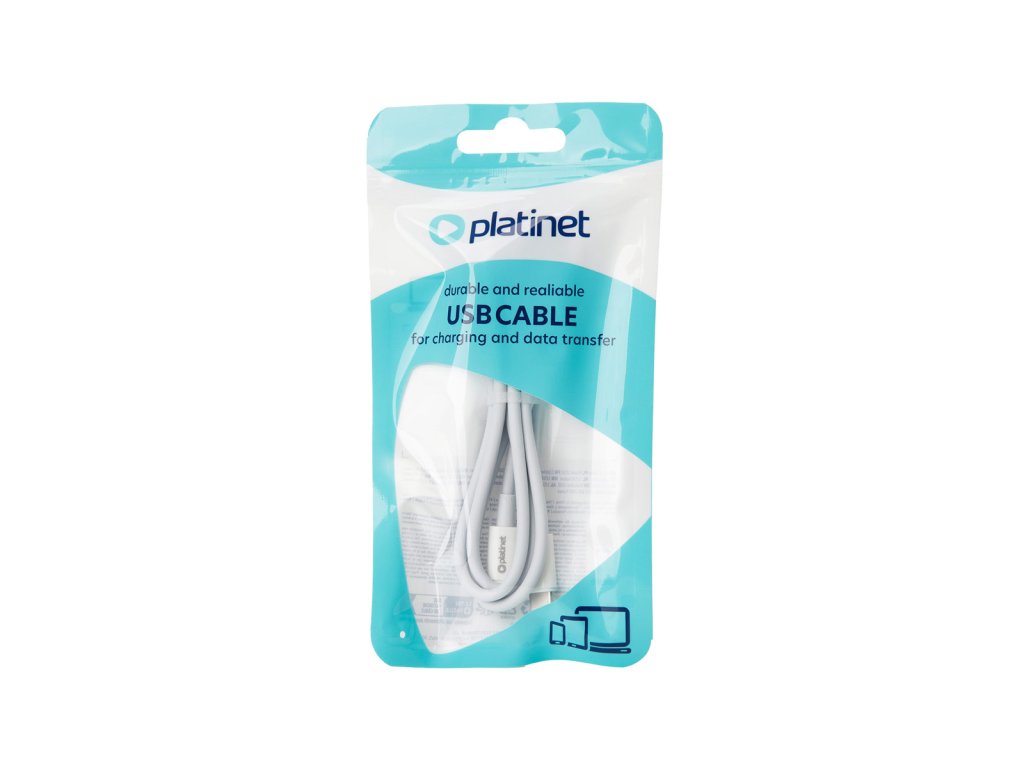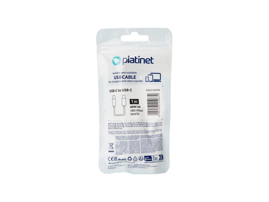 Bílý USB-C kabel Platinet o délce 1 m nabízí rychlé nabíjení s výkonem až 60W (3A) a přenos dat rychlostí 480 Mbps. Vyroben z odolného TPE materiálu, je ideální pro dlouhodobé používání. Kompatibilní s technologiemi Power Delivery a širokou škálou moderních zařízení. Bezpečný s certifikacemi CE a RoHS.
