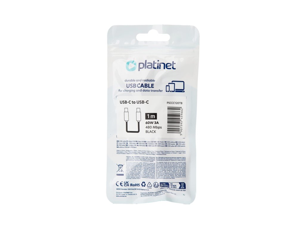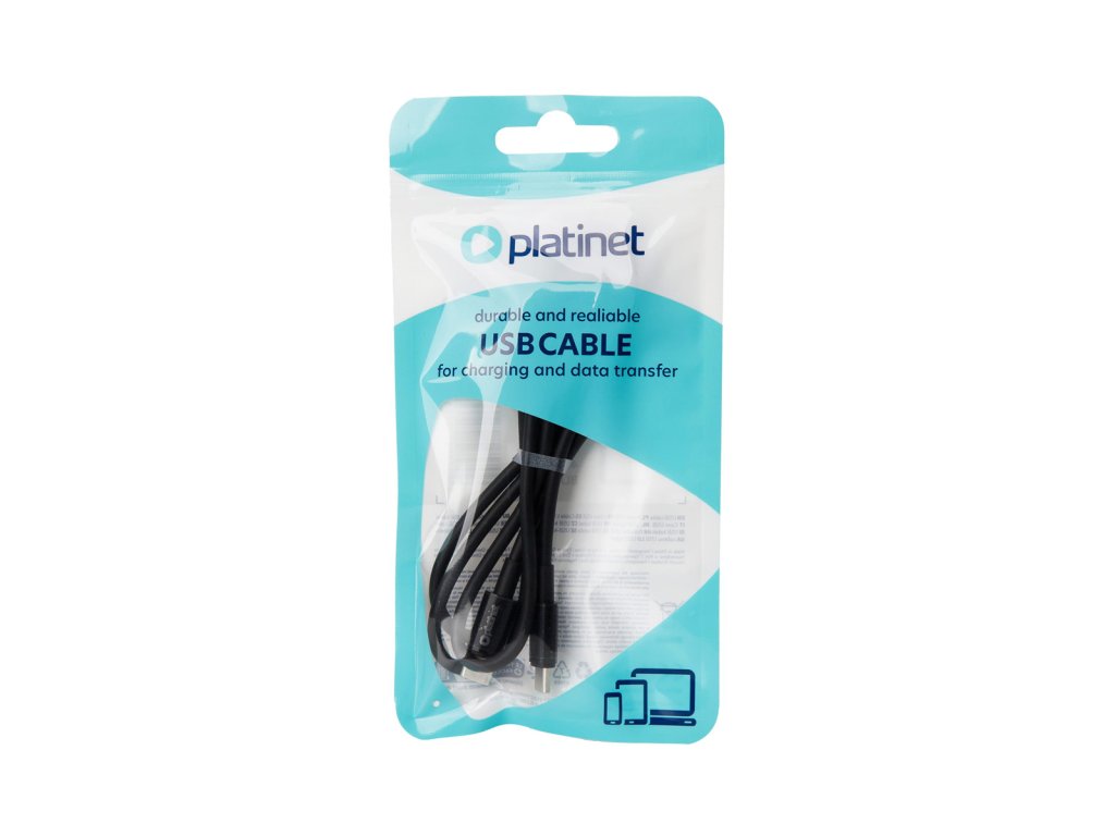 USB-C kabel Platinet o délce 1 m umožňuje rychlé nabíjení s výkonem až 60W (3A) a přenos dat rychlostí 480 Mbps. Vyroben z odolného TPE materiálu, je ideální pro dlouhodobé používání. Kompatibilní s moderními zařízeními a technologiemi Power Delivery. Bezpečný s certifikáty CE a RoHS, dostupný v černé barvě.