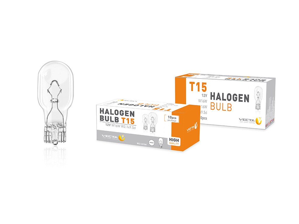 Halogenová žárovka VECTA T15 12V 16W, typ W2.1x9.5d (bezpaticová). Vhodná pro zpáteční světla, denní svícení a některá poziční světla. Kvalitní provedení, vysoká svítivost a dlouhá životnost.